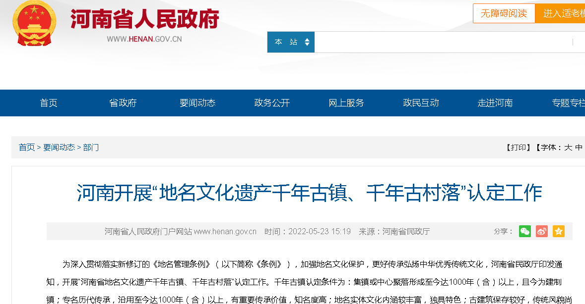 据悉,经认定为“河南省地名文化遗产 千年古镇、千年古村落”的,将列入申报“中国地名文化遗产千年古镇、千年古村落”备选名单。